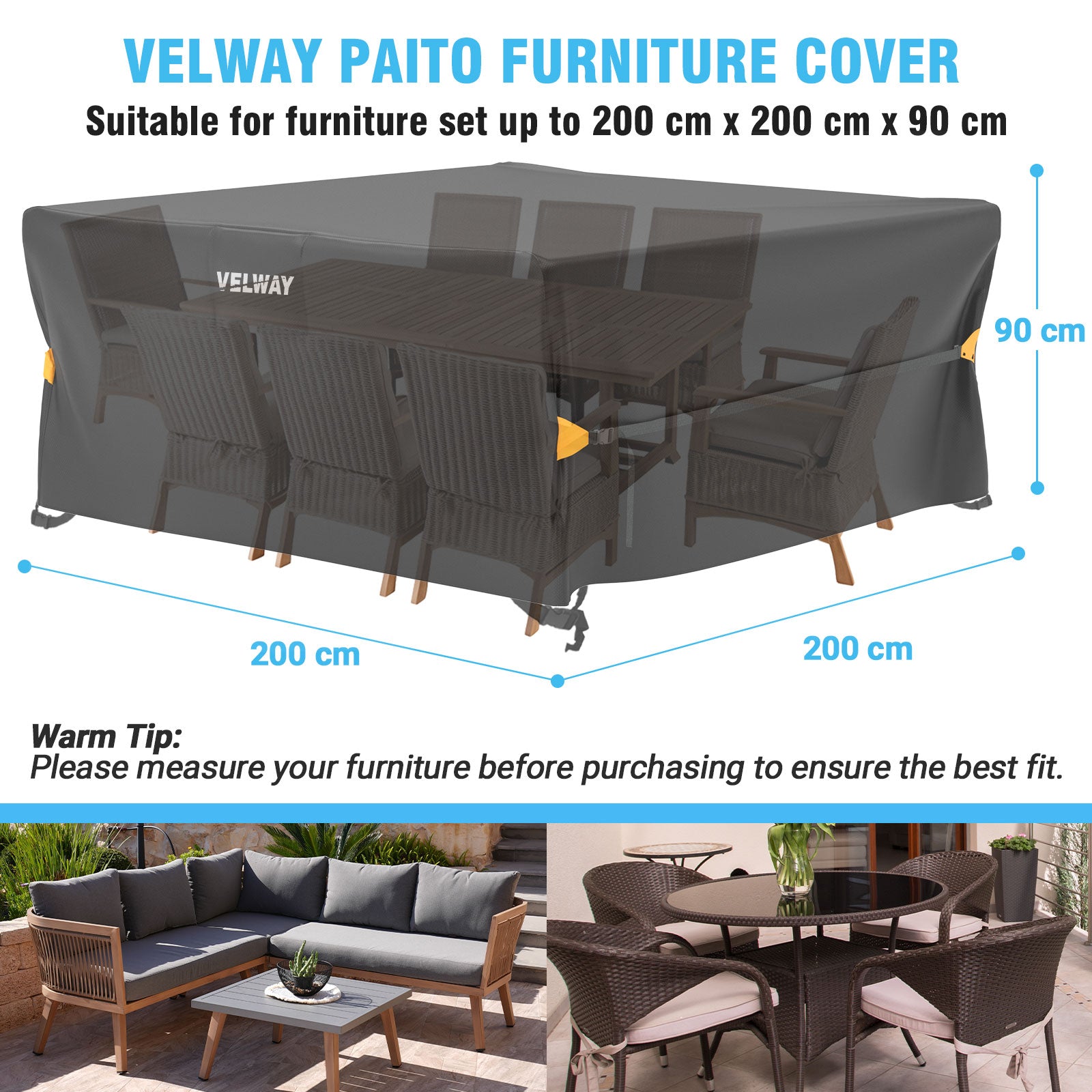 - Advanced material for excellent protection: Our Velway garden furniture cover is made of Oxford fabric with a silver coated interior to effectively protect your furniture from sunlight, rain and dust. For complete protection, we have reinforced the inner seams with waterproof tape.